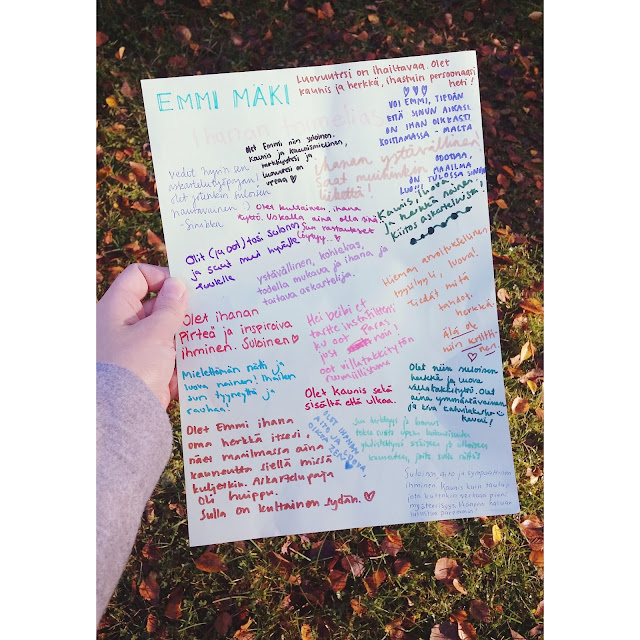 Makoiltiin jälleen patjameressä, yllämme jouluvaloja ja viirejä. Rakensimme majan, jonka alla tuntui satumaiselta. Yöllä seikkailtiin säkkipimeydessä peltojen reunamilla ja katseltiin tähtiä. Aamut oli kauniita ja syksyn tuoksuisia. Seistiin laiturilla, ja ihailtiin vastarannan ruskaa, mikä näytti mahdottoman upealta sinistä järveä vasten.